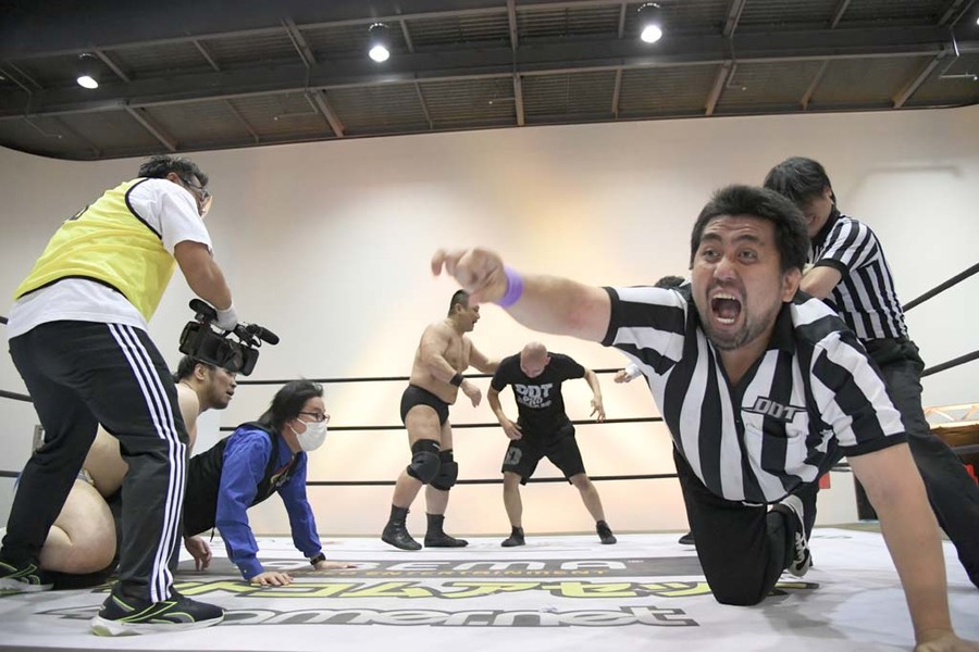 One of DDT’s longest-running feuds continued with a Popularity Deathmatch. The stip meant that any wrestler who announced their allegiance to Deino or Takagi would be free to interfere. The problem is that neither of them is particularly popular, forcing them to argue over wee Keigo’s allegiance.