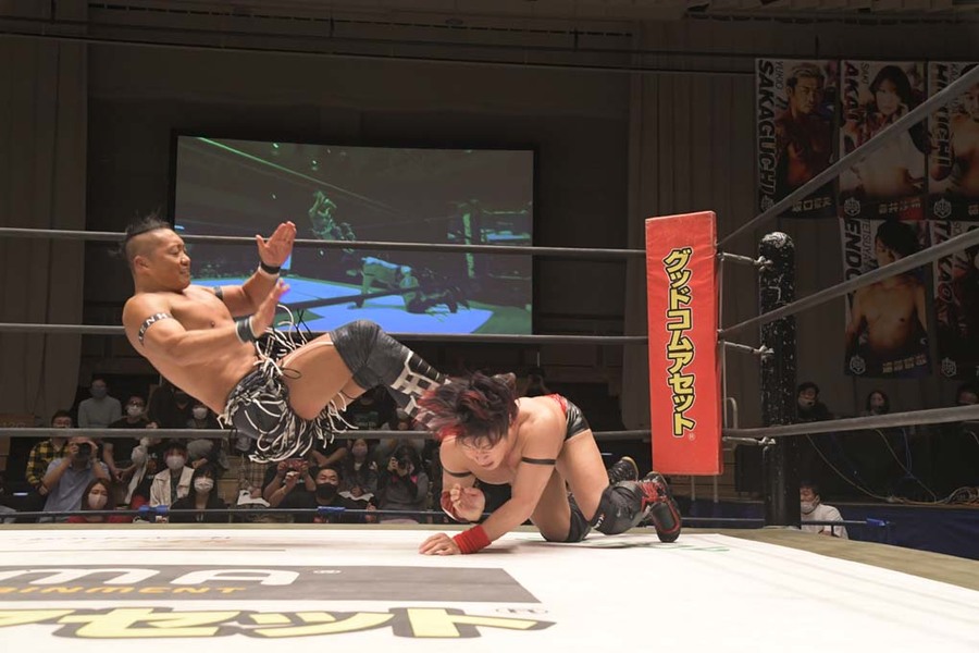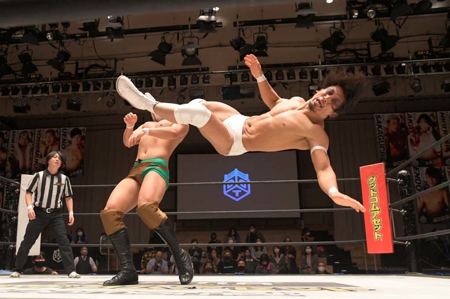 He was still out cold in the ring when the intro package finished, but they were nice and played his music for him anyway, while Dieno had nipped backstage so he could make his entrance properly. Is there a way we can get Keigo and Yuuki Mashiro in the same ring? I feel like that would create some good energy.