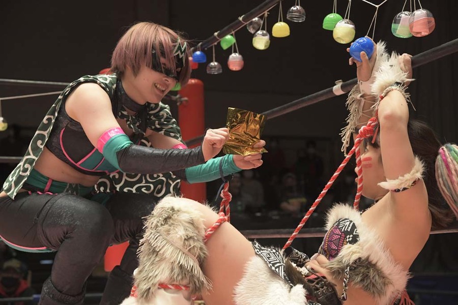 For this was your classic strap match with gacha. Not only were Shoko and Misao tied together, but the ring was surrounded by one hundred gacha capsules, ten of which contained winning tickets. For a wrestler to save their name, they simply had to find two of those winning tickets. Yes, folks, we were deep into Hyper Misao nonsense here, so unsurprisingly, I had a good time as they’d managed to put together a stipulation that wouldn’t have look out of place on an old TV game show.