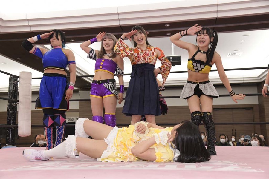 Yuka Sakazaki & The Bakuretsu Sisters (Nodoka Tenma and Yuki Aino) defeated Daydream (Rika Tatsumi & Miu Watanabe) & Pom Harajuku