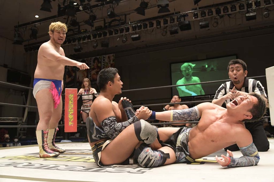 Danshoku Dieno, Saki Akai and Makoto Oishi defeated Akito, Toru Owashi and Keigo Nakamura