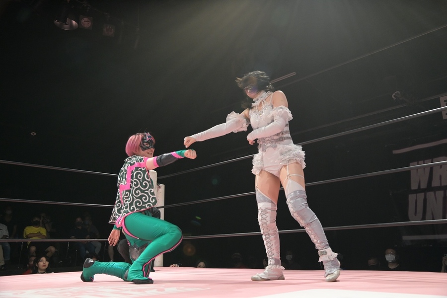 Moka continued the streak of wrestlers helping Namba with the pre-show announcements and coming off well. Inspired by the Olympic opening ceremony, she showed off her kabuki stare while they practised clapping and proved to be a lot more up to date on the rules than either Pom or Arisu.