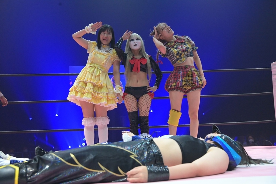 Ram Kaicho, Raku & Pom Harajuku defeated Mahiro Kiryu, Haruna Neko & Kaya Toribami