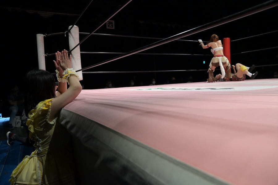 And Raku is so good at this stuff because who would ever suspect Raku of being the mastermind behind it all? She wears a yellow, frilly dress to wrestle in! Yet, she’s getting better and better at incorporating that streak it into her matches. There was even a moment where Shoko chased her around the ring, so she just happened to run past her personal superfan Yuki Aino, leading to Nakajima being mysteriously tripped. Of course, that wasn’t what Raku was planning, she’s just a nice train nerd after all.