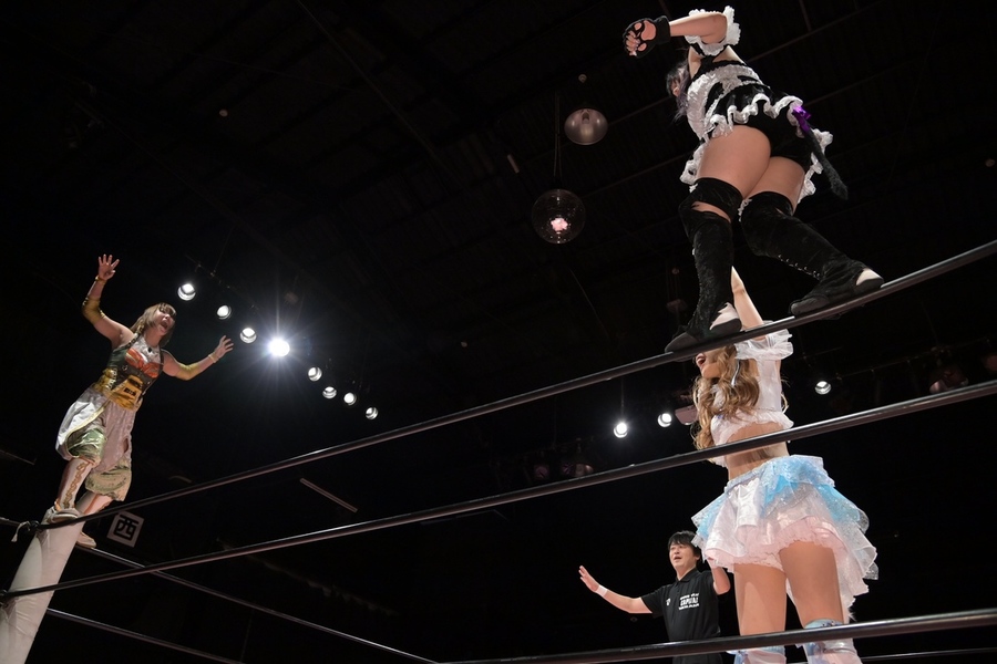 And Raku is so good at this stuff because who would ever suspect Raku of being the mastermind behind it all? She wears a yellow, frilly dress to wrestle in! Yet, she’s getting better and better at incorporating that streak it into her matches. There was even a moment where Shoko chased her around the ring, so she just happened to run past her personal superfan Yuki Aino, leading to Nakajima being mysteriously tripped. Of course, that wasn’t what Raku was planning, she’s just a nice train nerd after all.