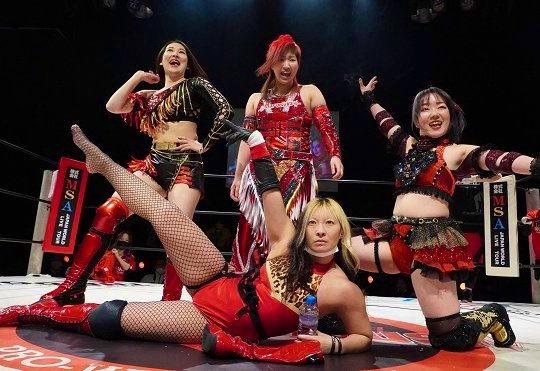 Jesus Christ, where do we start? This match, this beautiful, chaotic mess of a match. I watched the entrances three times before I even got started on the action, revelling in the utter insanity. People were dancing (some of them happier about it than others), Hibiscus Mii only had one shoe on, and Miyacoco was there, realising that it was kinda possible to sing her name to ‘Livin’ La Vida Loca’.