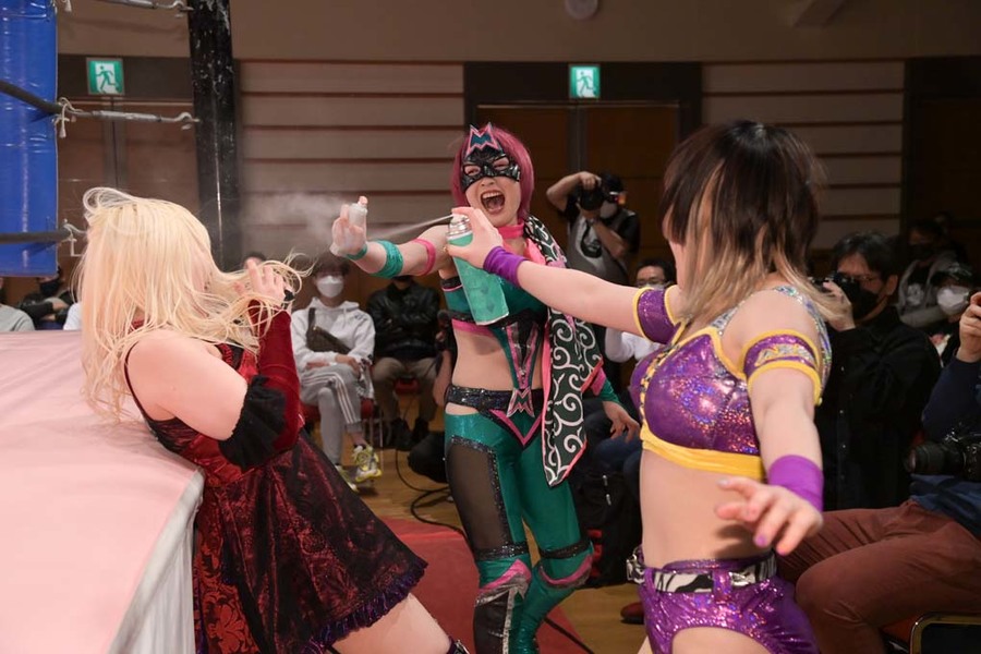 Okay, here’s the silliness I was looking for. I am a sucker for people hiding under the ring. All wrestlers share a common gene that leaves them completely flummoxed when someone disappears beneath the place where they make their living. It was Aino who was left confused here, Endo and Misao going missing only to reemerge and introduce her to some cold spray.