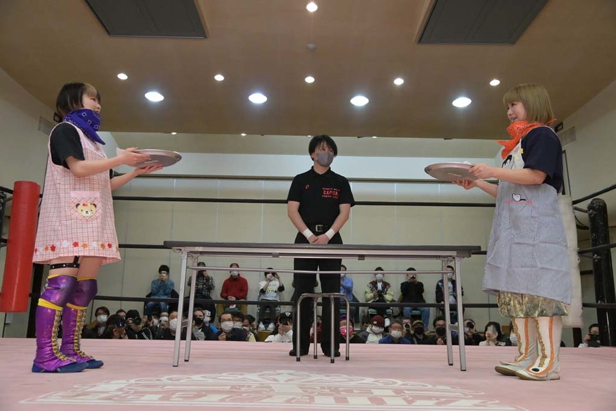 While watching this ‘match’, I described it as an evolved form of Ready, Steady, Cook, and I’m honestly not sure I can do better than that. It involved Arisu and Yuka competing for ingredients in a selection of games (including musical chairs and something that involved a blindfold and crisps). Then, once they’d assembled their various items, they went backstage to get cooking before later emerging so that Referee Kiso could taste both concoctions and decide on a winner. In other words, there was zero wrestling in this wrestling match, and I was delighted by that.