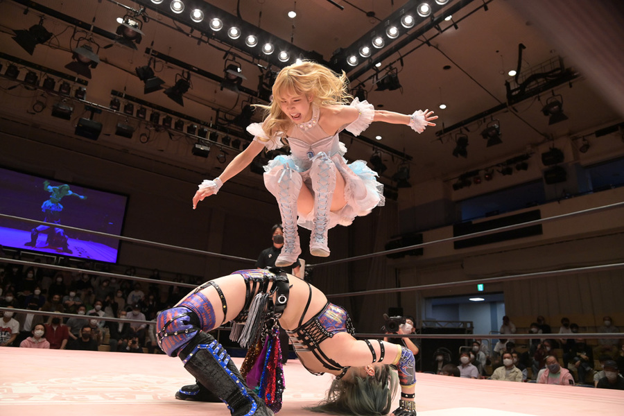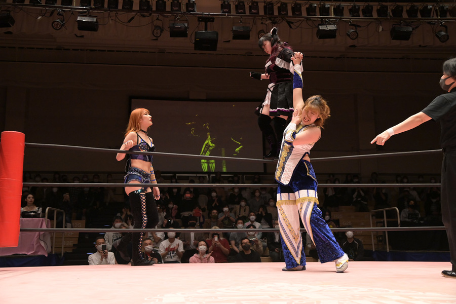 The match that would have originally opened the show was only three minutes long but had a lot of emotional heft. Reika Saiki hasn’t wrestled for a bit over two years and a half years after fracturing her jaw and recently announced her official retirement (from wrestling and muscles). Before she went, though, she wanted one last chance to rumble, taking on Arisu Endo, who is, in many ways, her protege. Endo was a member of the same idol group as Saiki (Cheer♡1) and was inspired to become a wrestler because of her. Not only was this a goodbye, but a chance for Arisu to wrestle her hero.