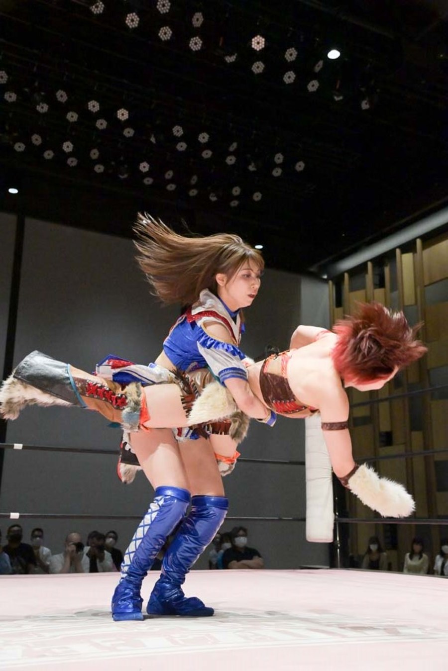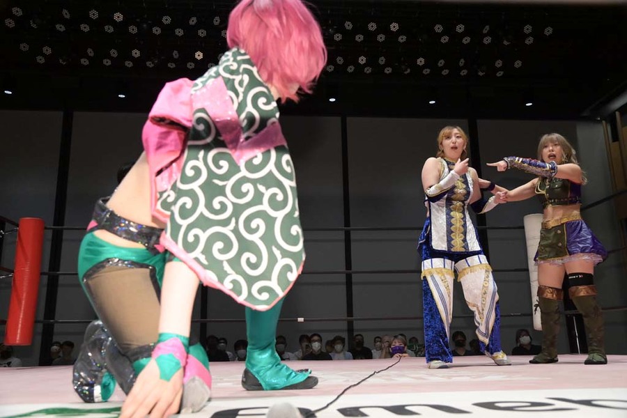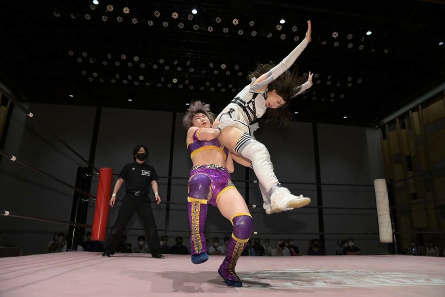 The last week has been a big one for Suzume. For the first time in her career, she stepped out from underneath the CyberFight banner, turning up in Gatoh Move to wrestle Mei Suruga and have what I believe was her first ever singles main event. Now, back in her home promotion, she’s already got her second one, facing off with Miu and looking to get at least one point on the board for her team.