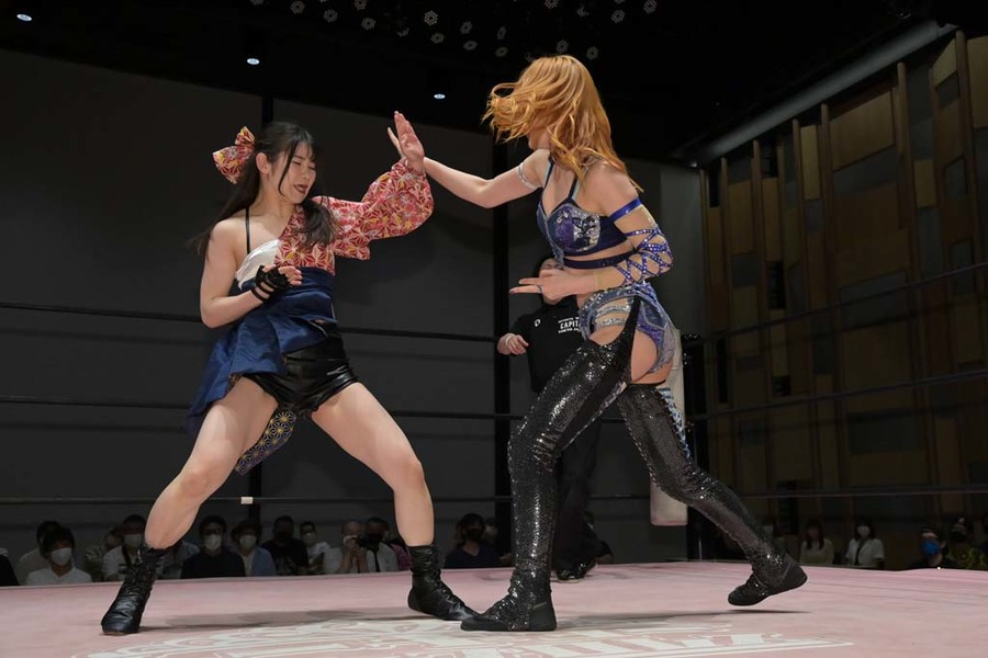 Our first match of the mini-tournament featured two people whose careers couldn’t be more different. Kamiyu always had the charisma but had to grow into a wrestling style that worked for her. In contrast, Moka struggled early on to stand out, but slowly and surely improved as a worker, finding her charisma through her in-ring abilities. They’re both equally valid ways to do it, but that difference made this pairing intriguing.