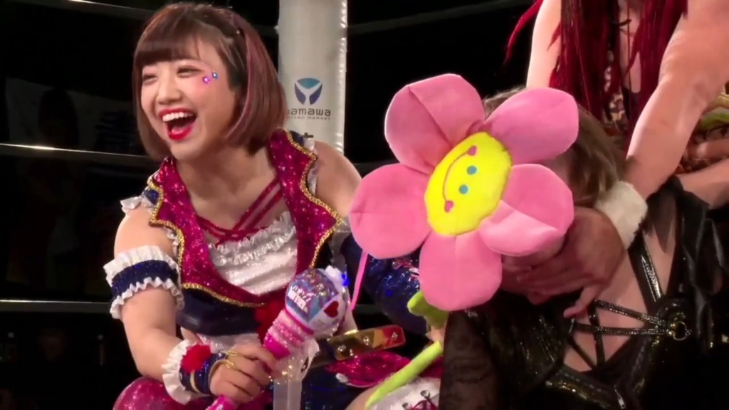 The secret ingredient, however, was Rina, who is used to making every match she is part of at least 30% better but did a particularly stellar job here. Her role was to go to war with Ozaki (they would eventually brawl (alongside their seconds) to a double countout, leaving a knocked-out Momoka to clinch an unlikely victory) while also enabling all of Hanazono’s antics. She was delighted to egg this giddy youngster on, aiding her in winding Ozaki up as much as possible.