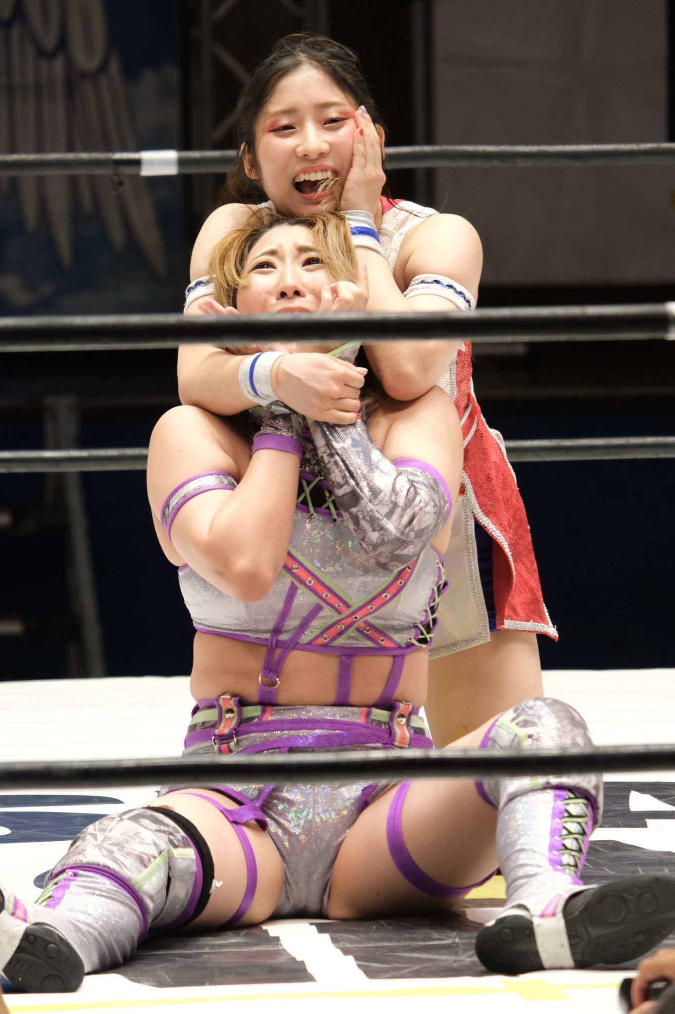 There was a moment in this match where Hiroyo, having just had to deal with Mei Suruga, rolled her eyes in a mixture of confusion and frustration as Momoka Hanazono ran around her, refusing to engage and entering full pest mode. It was a look that perfectly summed up what I assume wrestling MomoRingo is like. These two nuisances beat you not through superior wrestling ability (although they’re both brilliant) but by being bloody annoying.