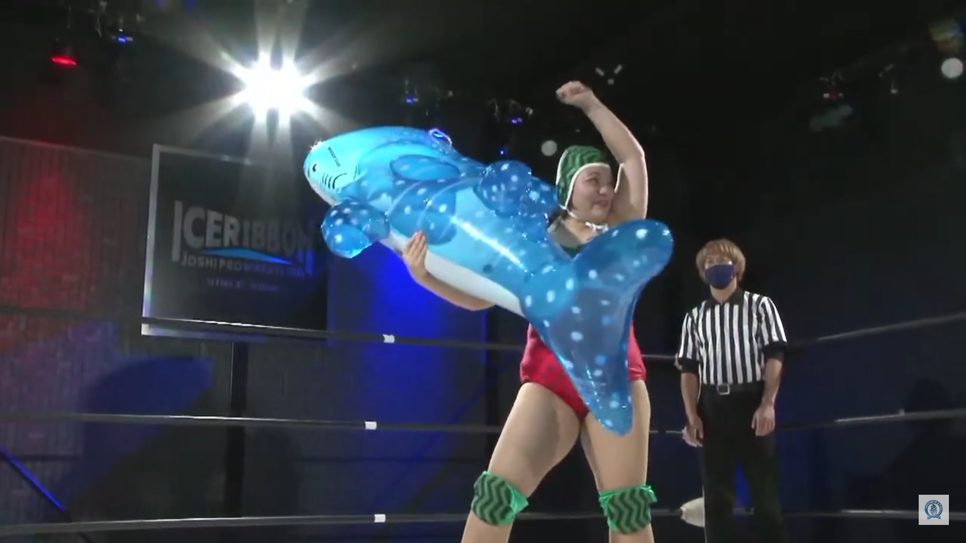 Saran’s opening matches on Ice Ribbon Dojo shows might be my wrestling happy place. So, when Totoro came out for this in a swimsuit carrying an inflatable shark, I already suspected I would love it. By the time Saran had nicked the shark and started beating Totoro with it, there was no doubt about it.