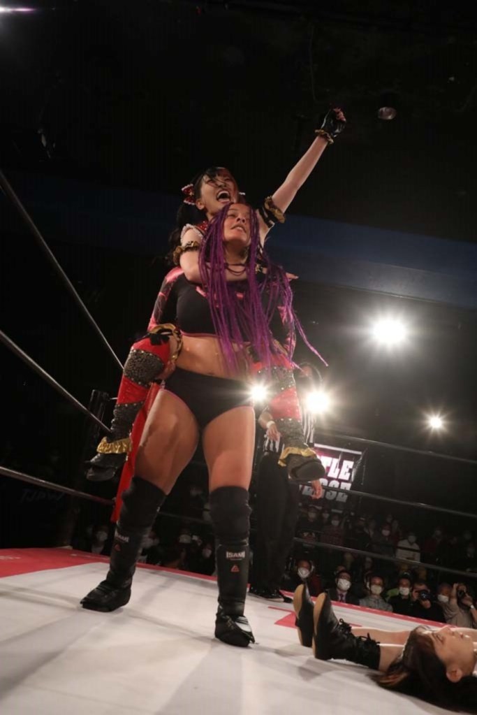 Maki Itoh & Rhio defeated Yuki Arai & Moka Miyamoto