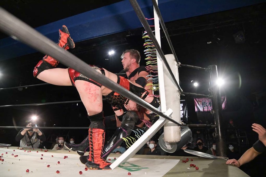 And while Sera has previously proven herself in the deathmatch realm, this felt like her going back to square one. Before, it was under the safe umbrella of Ice Ribbon, a company where, at any moment, she could decide she didn’t fancy getting stabby for a living. Now, Prominence (and deathmatches) is Risa’s everything, and if it is to be a success, she has to step up and prove herself against the best. Sasaki beat the shit out of her here, causing blood to cobweb across her skin, but she refused to die, taking every blow and coming back for more. Then, when she did get to attack, it all came out in a glorious rush of violence, including her barbwire cane having a piece of that spiky wrap come free and turn it into an even more vicious whip.