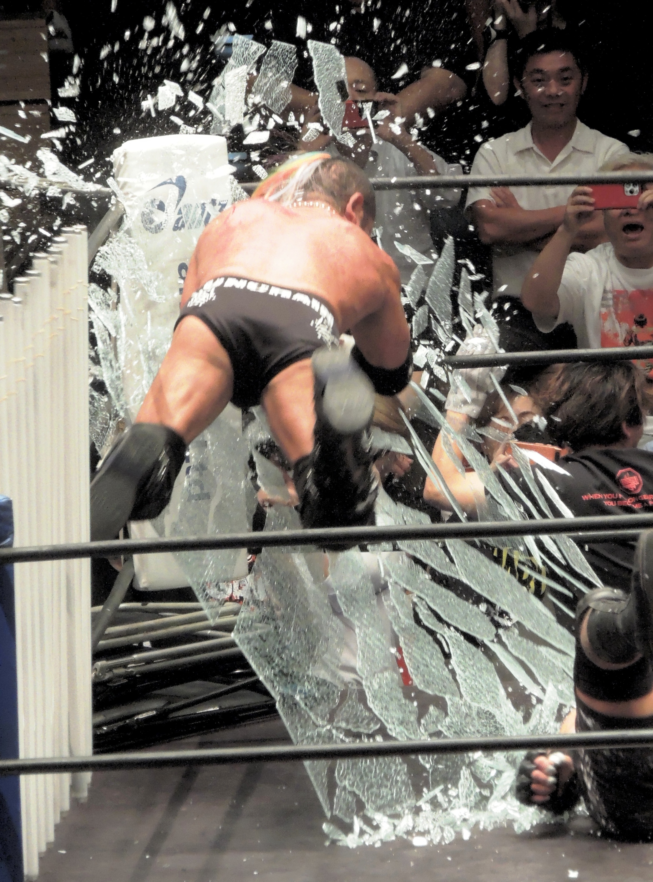 And make no mistake about it, this was a bloodbath. Kasai vs Takeda is a living walking ‘men would rather x than go to therapy meme’, as these two mad men express their love for each other through blood. It didn’t take long for them to start to get stabby, glass shattering as they threw themselves and each other through it at every opportunity. So much analysis of deathmatches comes back to the idea that if they do some proper wrestling in amongst the violence, it’s somehow legitimised, but that’s never been a bigger load of shite than when you’re watching these two do their thing. Sure, they can trade holds, but their latest violent act is as much wrestling as any armbar has ever been because it’s all about emotion. It’s the story of two men, at the very apex of the form, pushing each other to go harder and faster, one-upping each other not through hate but through their love for each other and the art form they’ve chosen.