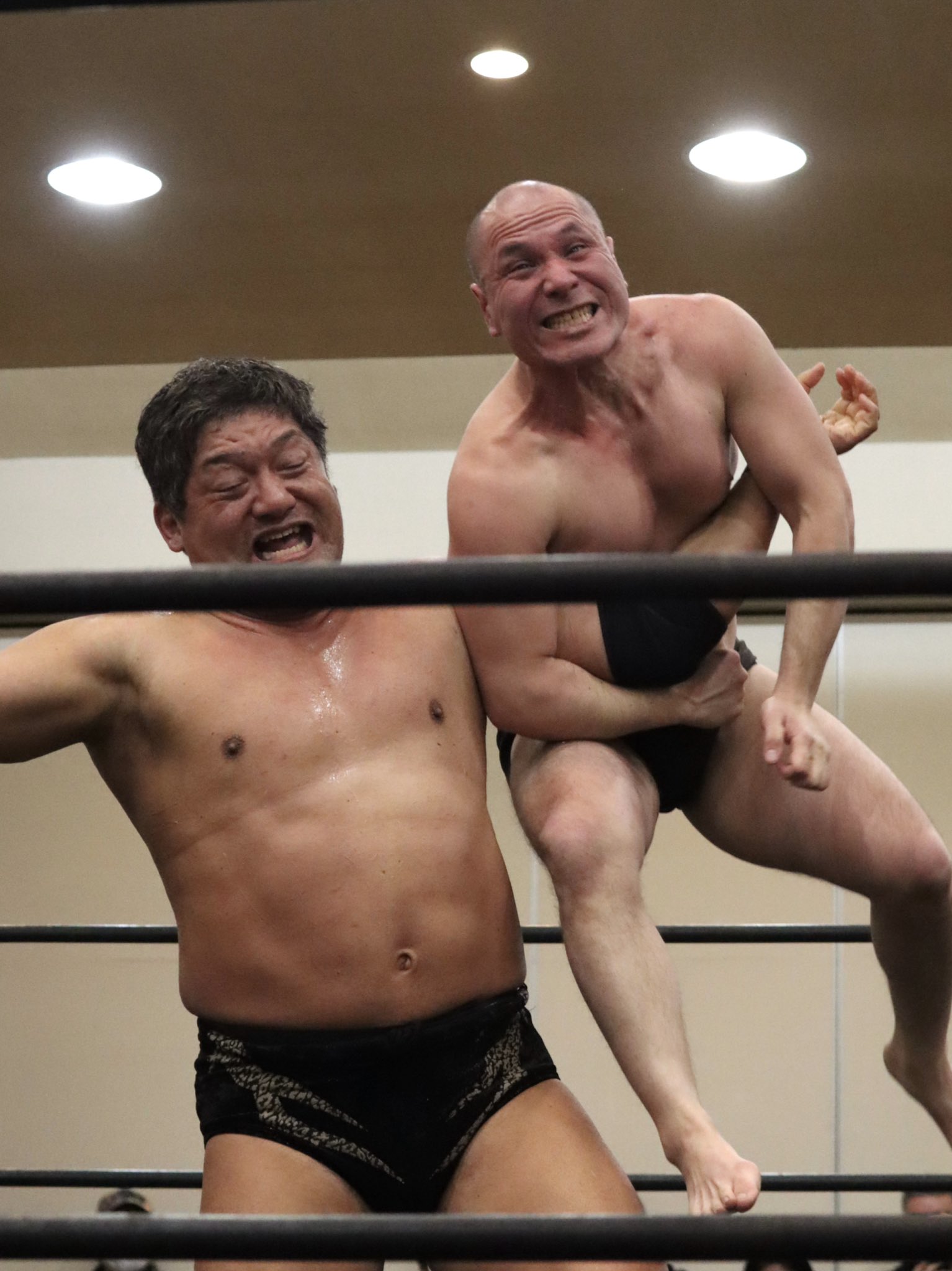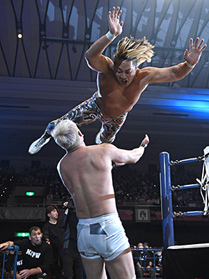 And when he did, he was brilliant, focusing on Ishikawa’s arm and unleashing that babyface fire which comes from his love of Dusty Rhodes and old-school American wrestling. He was stumbling about the ring, on the cusp of collapsing from the beating but finding it in himself to keep going. There’s nothing fancy about it, but there doesn’t have to be. All the simple stuff is done so well that you don’t need anything else, every strike crisp and Honda’s attack of the arm consistent and well thought through. It was so good that he even managed to sneak in one last bit of comedy, taking the traditional dropping of his singlet straps a step further and stripping to his underwear, a spot that somehow took on a touch of dramatic tension in this scenario. When you can start removing your clothes without denting the flow of the action, you know you’re doing something right.
