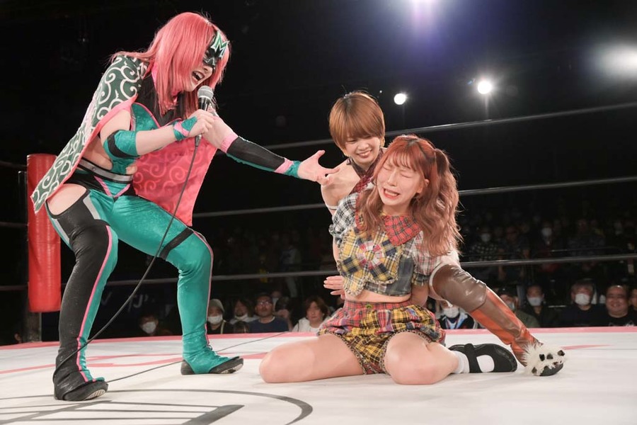 If anything, Miyu seemed to be in the mood to dish out a bit of a humbling. She’s not immune to the charms of younger wrestlers, but she had her game face on, hitting hard and not giving up an inch of space to Wakana or Toga. They both tried to bring the fight to her, but it was a losing battle, as their only real route into this match was through Moka. Even that wasn’t easy, though. She shrugged off Wakana’s first attempt to lock on the sleeper and seemed to be drawing energy from her partner, flaunting her veteran status over these two younger wrestlers (in a good way).