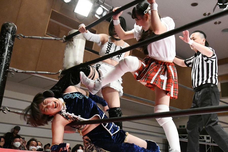 To give Poi her credit, she excels at battling back against impossible odds. I guess being Miyu Yamashita’s kicking bag helps you get good at that stuff, and when she rallied, scrambling for a way to get past these two huge walls, it was hard not to get wrapped up in supporting her. She’s got a wonderfully expressive face, and while it’s often got a look of bafflement plastered across it, she still had me secretly cheering her on, hoping she could find a way to even the odds, even if just for a second. She couldn’t, but hey, at least she tried. Welcome back, Poi. I honestly don’t hate you.
