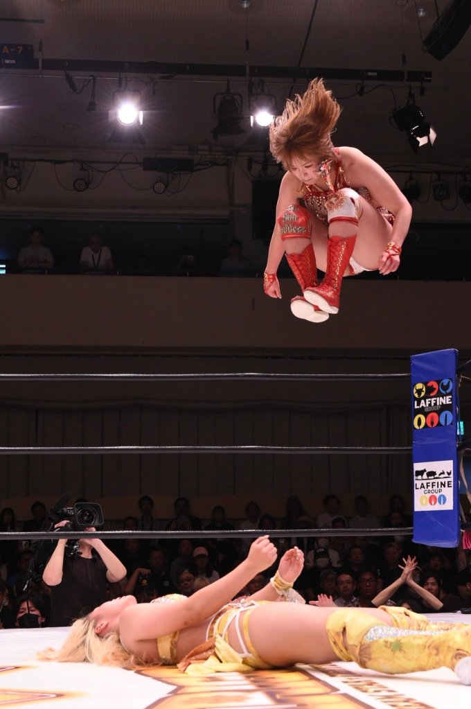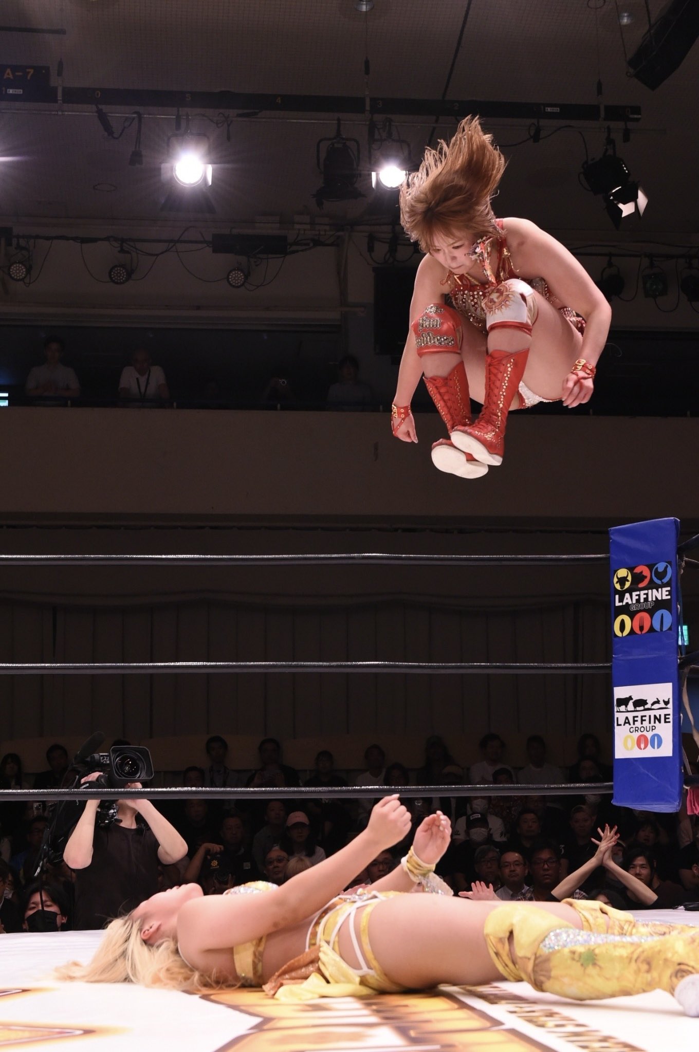 Of course, the Mio vs Mizunami stuff also ruled. Aniki was in her usual cheerful mood to begin with, as she goofed off while delivering her machine gun chops in the corner, but Mio didn’t let her stay there. A slap around the face waking her up. We also saw Momono succeed in getting Manami all worked up, the two of them grabbing fistfuls of hair as they exchanged strikes, turning a typical time-filler into something fuelled by anger. I know I go on about Mio constantly (see above), but her brilliance is matched by an ability to get the best out of others.