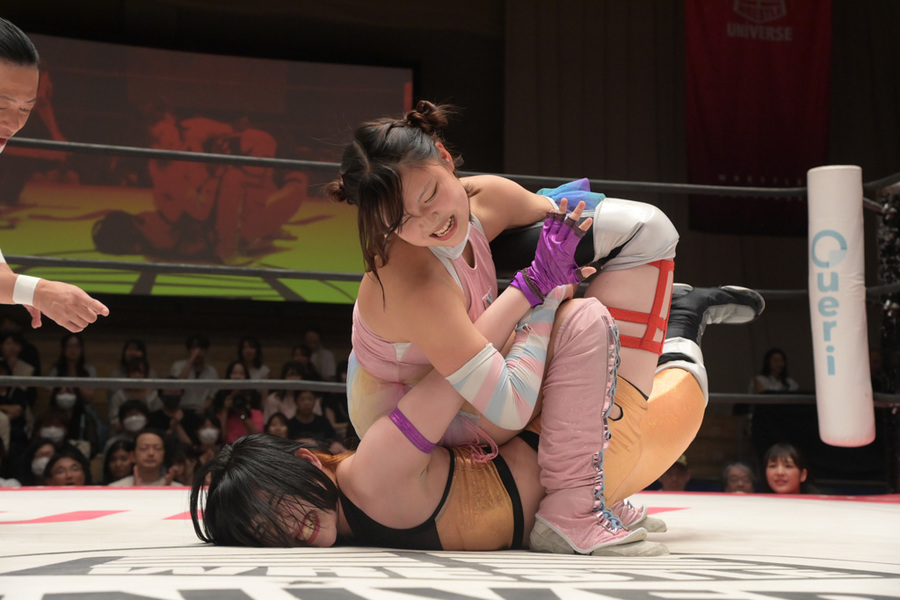 In return, Mizunami gave her a lot. A combination of the occasion and respect for her former partner brought the serious side out of her, as there was little to no messing around once the bell rang. She was going to lay everything on thick but also sell her arse off, at one point ending up dangling in the ropes with her head on the apron after being planted with a Venus DDT. You got the impression that she’d come for a fight but was still caught off guard by what Aino brought to the table, the typically mild-mannered figure snarling as she threw everything at Mizunami.
