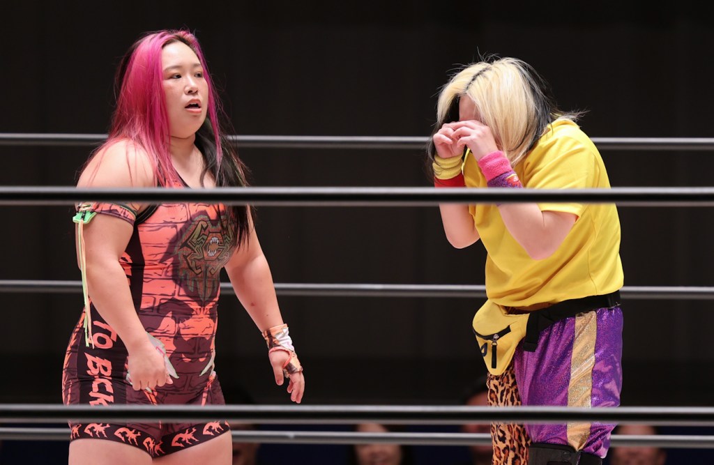In the moment, I’m down for it. Yes, when you consider the kayfabe of it all, it doesn’t really make sense. How long after Kawahata was pinned did they decide the next course of action was to shave off their eyebrows and wear black? Did they have to go out to buy the clothes? But I’m not boring enough to worry about that stuff for too long. If this is done right, we could be about to add a heel edge that hasn’t existed in Marvelous since Hibiki was around. With two new rookies wearing the red and blue already on call, that could be very exciting. If it’s not, well, we’ll be able to laugh about the time Magenta went goth for a bit.