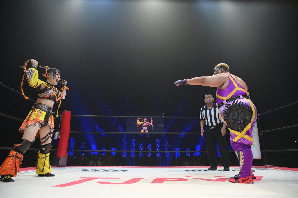 Talking about knowing what to expect. Aja Kong’s role in TJPW is well established. She’s either there to do odd-couple comedy with Raku and Pom or to school someone in a short singles match that will, hopefully, give her opponent something in defeat. Wrestle Princess gave the Powerful, Cheeky Chappy an opportunity to try her luck at the former.