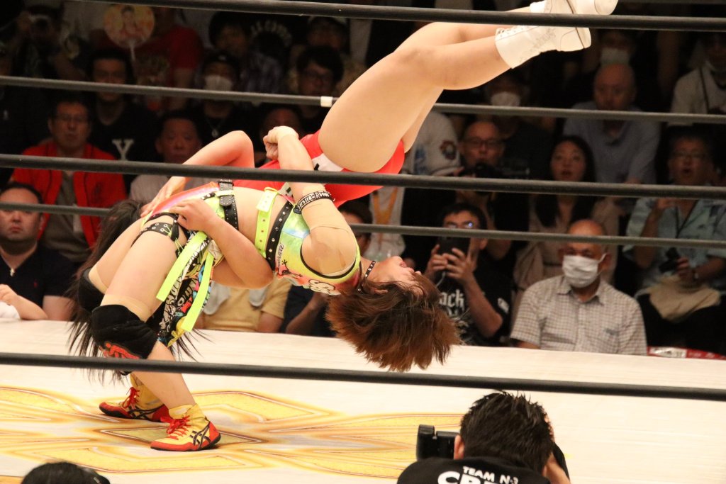 And yet, that’s not this match. If anything, it’s Mei who plays the antagonist here. She’s the one who goes dirty, trying to throw Rina across the ring by her hair, before showing off a touch of that Best Bros’ cockiness when she gets the advantage on the outside. She never goes full menace – this isn’t her wrestling a rookie in Ichigaya – but she definitely leans into that element of herself. Yamashita has come into her home, and while Mei has been bullied there before, she’s now the all-dominant champion, and she seems unwilling to let it happen again.