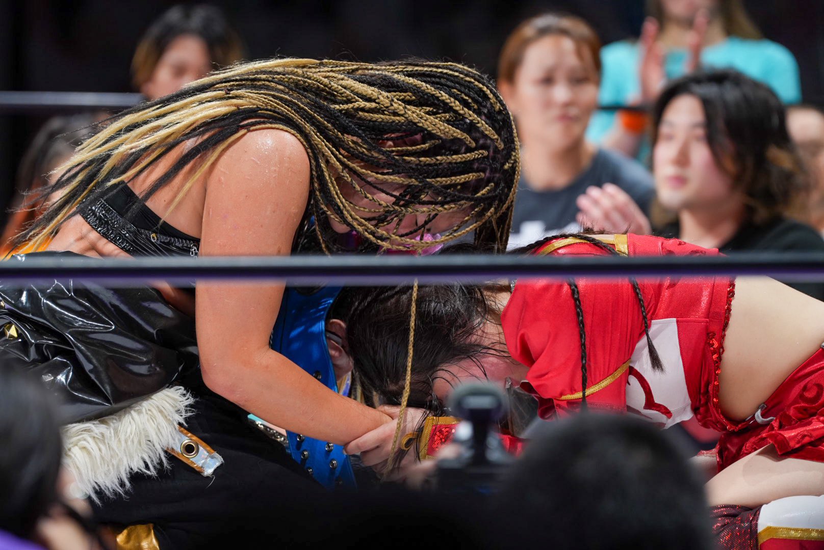 You can read that as Seto’s desperation to end her career on a win, something she never managed in a singles match, and I don’t think you’d be wrong. However, it also feels like someone who is facing all that emotion bubbling up, and is well aware that if they pause, it will become too much. In fact, this whole match reads like that. Nonoka is relentless in a way we rarely saw from her, constantly coming at Hiyori, slamming her leg into the ground or wrenching on her neck. In some ways, it’s the most focused performance of her career. In others, it feels like someone who is going on the attack as a method of holding it all together. It’s one of the rawest performances of the year, real and honest, constantly on the verge of teetering over.