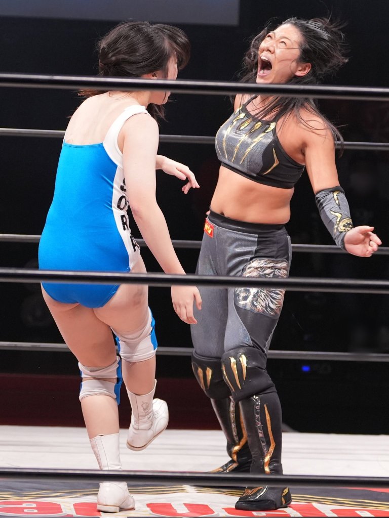 It also helps that the shin kicks are getting over. Sure, Chigusa Nagayo going wild for them probably helped, but the reaction is there regardless, as Sora repeatedly went to them against Iwata. Credit to the Sendai wrestler, she sold them all. Those things could easily be a comedy bit, something to be shrugged off, but as anyone who has been booted in the shin can tell you, it fucking hurts. There’s something about the relatability of that pain that I think could really work for Sora, who is already an easy figure to empathise with. If Senka is going to be the bluster, Sora can be the sympathy.
