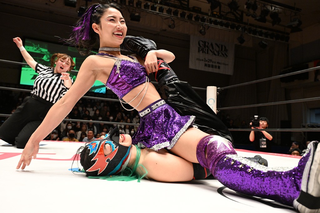 Yuka Sakazaki, Mizuki & Yuki Arai defeated Max the Impaler, Raku & Pom Harajuku