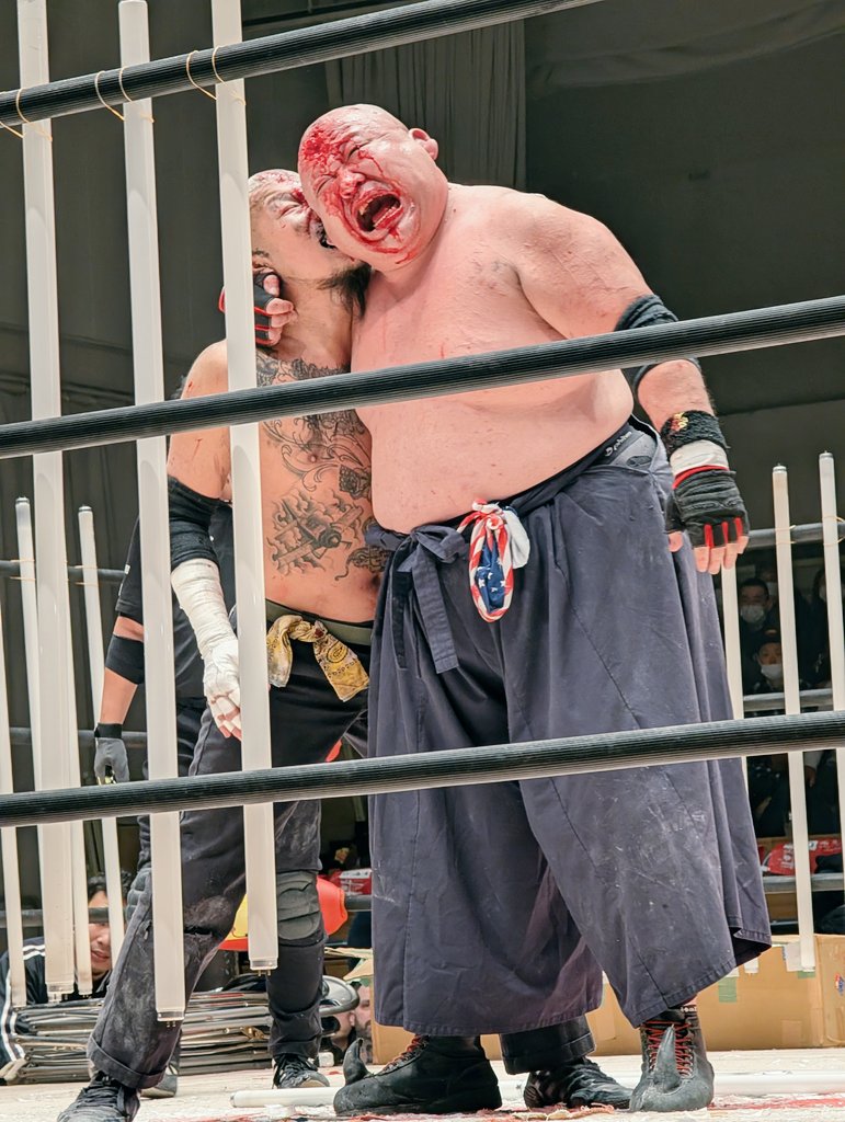And that’s what makes this match. I won’t pretend to have a clue what’s going on in BJW, but Ito seems like he’s a wee shite, and Abby’s here to put him in his place. Within seconds of the bell, Kobayashi’s bleeding, and it’s not much longer before he ends up with a fork sticking out of his forehead. As you’d expect from a BJW deathmatch, the blood sticks around for the rest of the bout, although eventually it is joined by a substantial amount of black ink. Ito blows it into Abby’s face, and, unfortunately, it does make it look a little bit like he’s blacked up. He hadn’t! But I suspect one or two people might see pictures and have a momentary spark of worry.