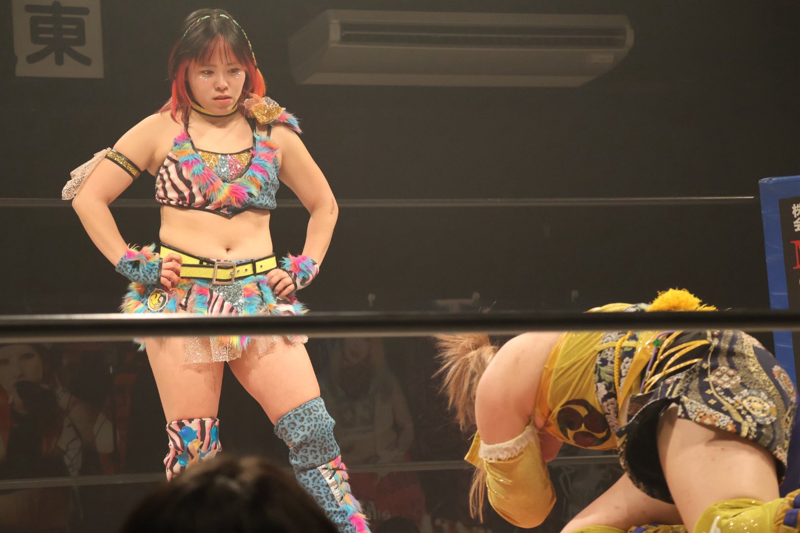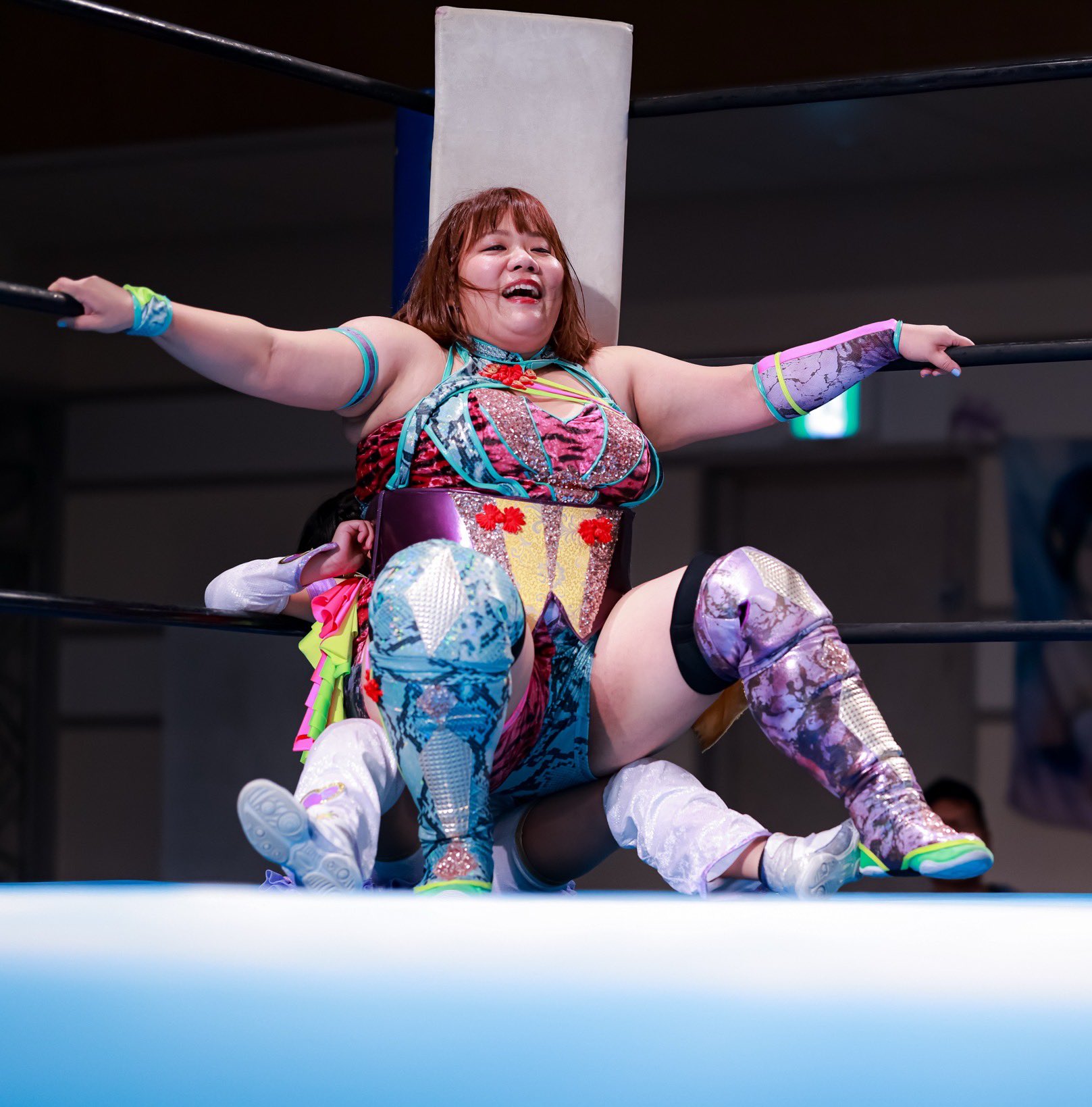 And it was that booing that changed the match. Eventually, Nagayo had enough, demanding that Iroha take off her kickpads to open herself up to those shin kicks. As she untied them, Sora started practicing her swing on the corner pad, hammering away at it, something that I can’t imagine her doing even a month or two ago. When Iroha was finally free, she went to work, not only booting those shins, but also grabbing her by the ears and pinching the undersides of her arms. In another’s hands, it would be heel work, but Sora is so clearly the underdog here that everyone reacts to it with delight. She’s narrowing the playing field in whatever way she can, and while Iroha did eventually choke her out, she got a fright before we got there.