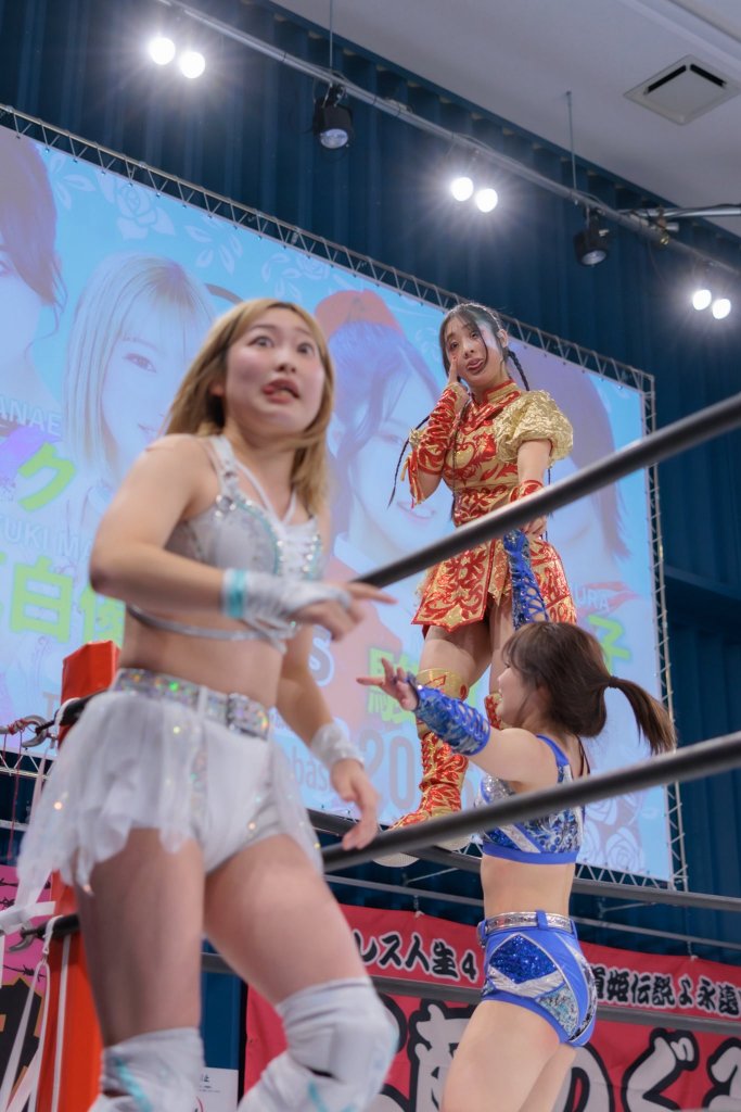 And it’s funny, watching this match made me realise that Yoridori Hiyori remind me of Egg Tarts. Not in a stylistic sense. They’re very different teams. No, it’s because Obi has figured out how to channel Yawata. Once upon a time, that’s exactly, both in and out of kayfabe, what Hagane did for Chie. He took that boundless energy and enthusiasm and helped her focus it. Chie was always a fun wrestler to watch, but it was after Egg Tarts’ initial run that she became confident in working title matches at the top of the card. Hiyori needed someone similar. Not because, like Chie, she was in danger of bouncing out of the room, but because of the need of a guiding hand to ground her more exuberant tendencies. Who better for that role than consummate pro Obi? She had the least flashy job in this match, but she was vital to how it went. Obi made sure Hiyori was in place to shine.