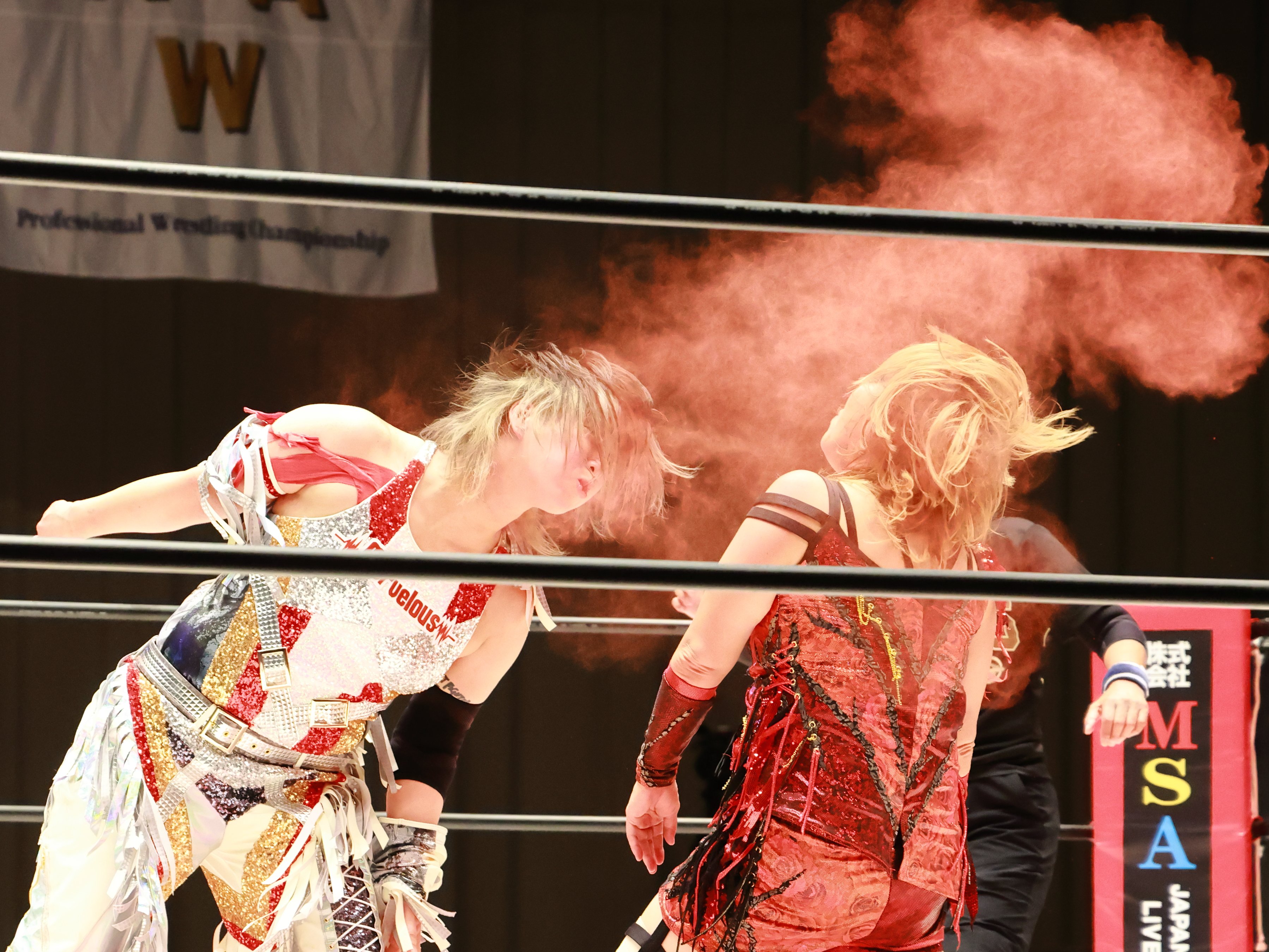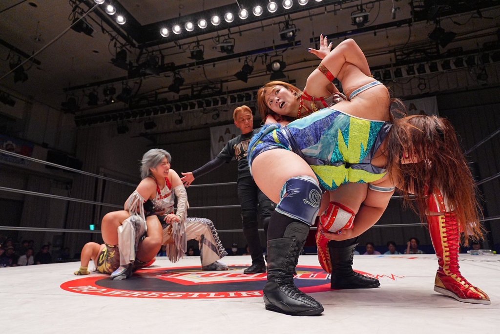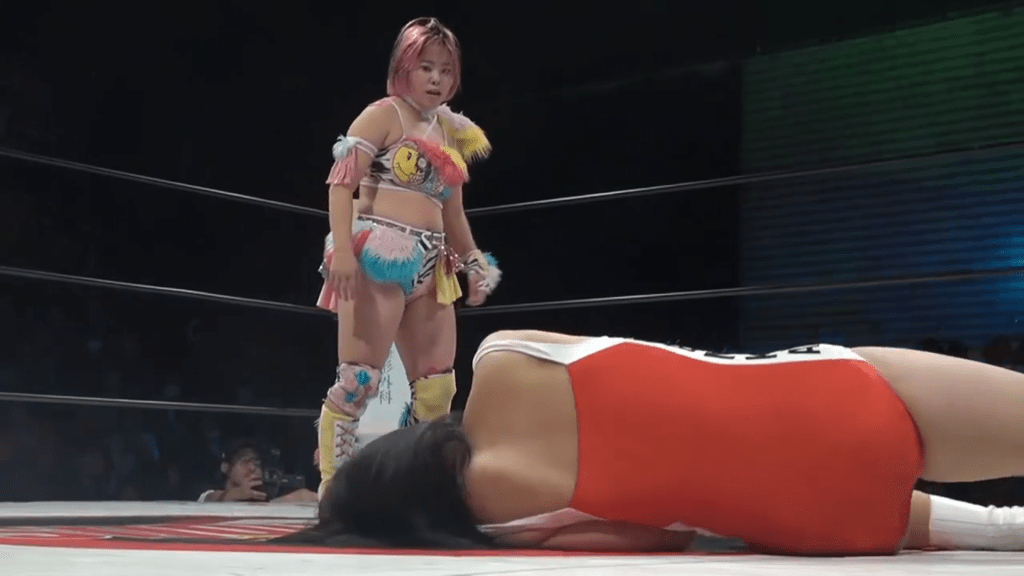 Takumi Iroha frustrates me. She has all the tools required to be an incredible Ace, but all too often, it feels like she’s holding back. It’s most evident in her tendency to slap her thigh rather than really punish people with those kicks, but it also shows elsewhere. She’s too cool (and protected) to convincingly play the underdog, but she also never seems to dominate people quite like I’d hope. I suspect it’s why my favourite matches of hers are often against other Marvelous wrestlers. Facing off with a Mio Momono or even an Ai Houzan, she feels comfortable enough to unleash. Yet, when you put her up against Mayumi Ozaki, setting her up to avenge Marvelous’s beatings, she doesn’t have the grit to make it feel definitive. Sadly for Sora Ayame, she had no such qualms when facing her.