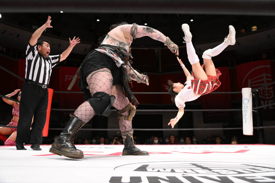 When the draw for the first round of the Max Heart came together, one pairing stood out above all others: Max vs Uta. Max’s best moments in TJPW have come when they’ve provided them with a crash test dummy (typically, her partner in this match, Pom), and the idea of the smallest, squeakiest member of the Up Up Girls fulfilling that role was an instant win. I needed to see if Uta could fly.