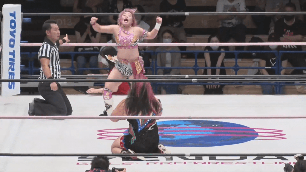 I don’t normally write about Sendai Girls, but with their storylines getting ever more intertwined with those of Marvelous, it felt like it was probably time to stop by. Plus, Mio was challenging for the belt, and I’m never going to miss an opportunity to rave about her and Big Hash.